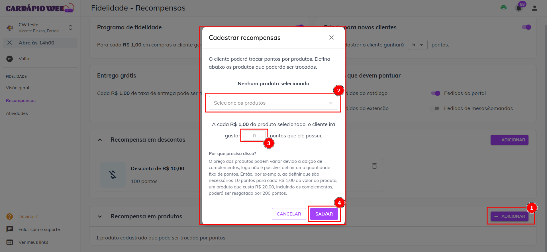 * **Resgate de produtos do seu catálogo:** Você também pode disponibilizar para o seu cliente usar os pontos para resgatar algum produto do seu cardápio.