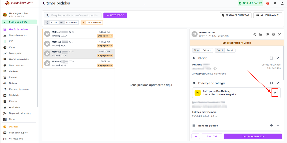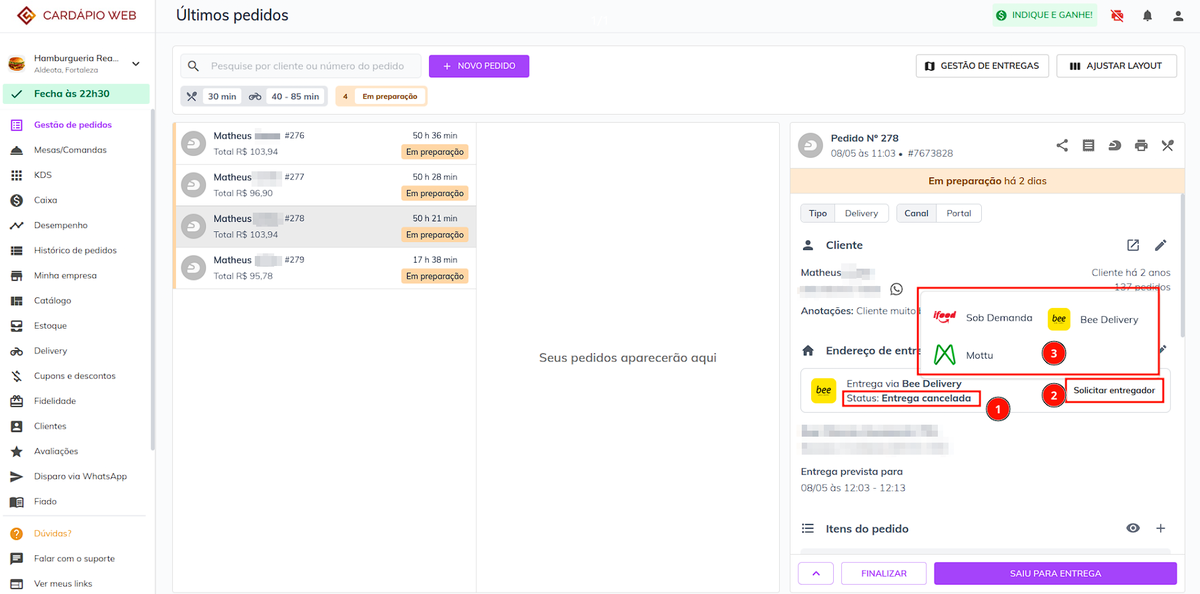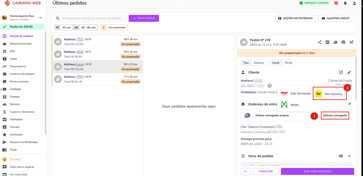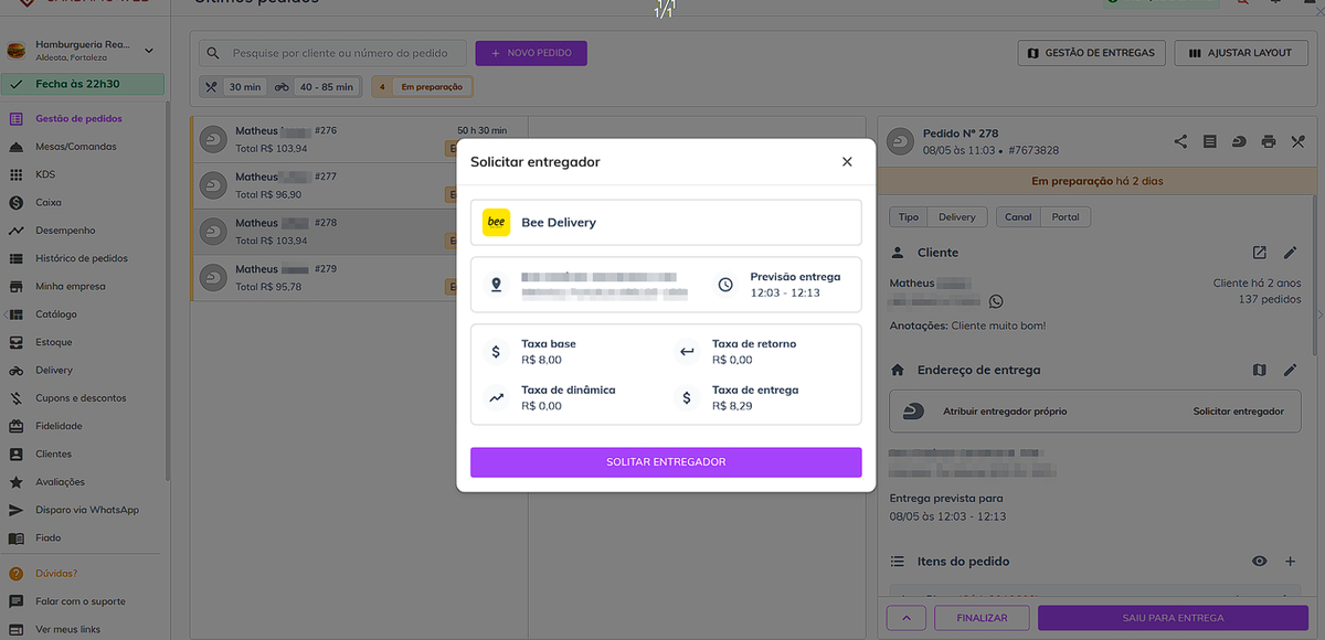 Após ativar a integração, na tela de **Gestão de pedidos** irá ter a opção de solicitar um entregador da **Bee Delivery**.