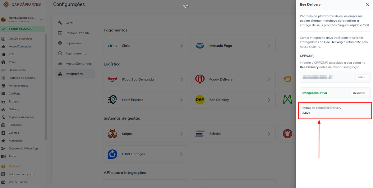 Com a integração ativa, é possível ver o status da conta do cliente na Bee Delivery. Se o status não for **Ativo**, o cliente pode não conseguir solicitar entregadores e precisa entrar em contato com a Bee Delivery para entender melhor a situação.