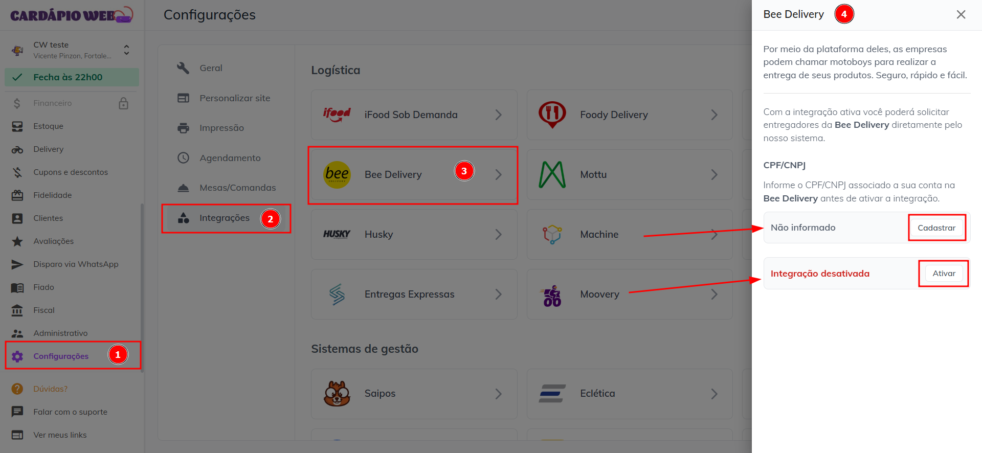 Para a ativar a integração é só informar o **CPF ou CNPJ** cadastrado na Bee Delivery e clicar no botão de **Ativar integração**.