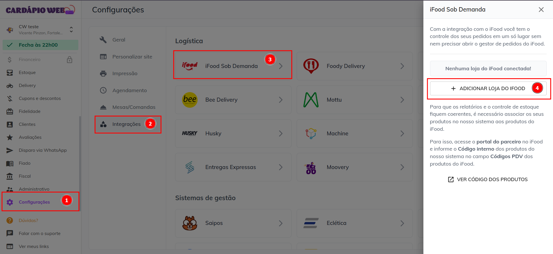 Acesse às em **“Configurações”**, selecione **“Integrações”**, clique em **“iFood Sob Demanda”** e em seguida, escolha **“Adicionar Loja do iFood”.**