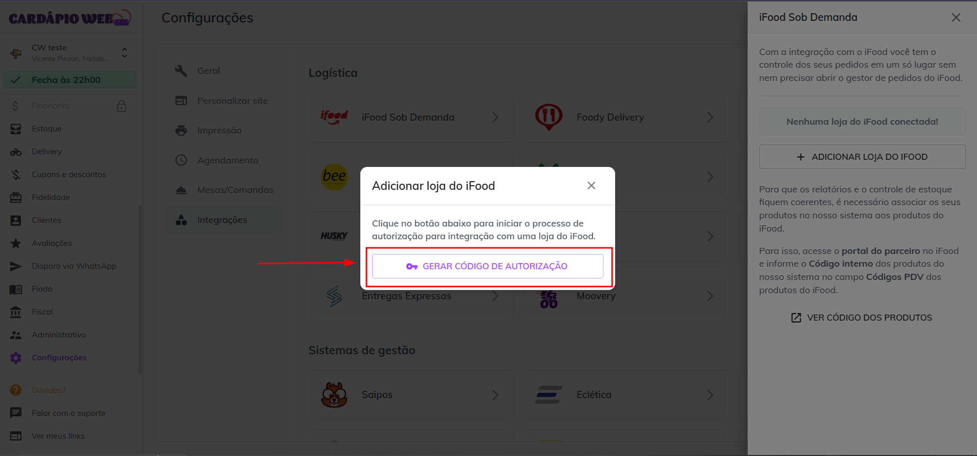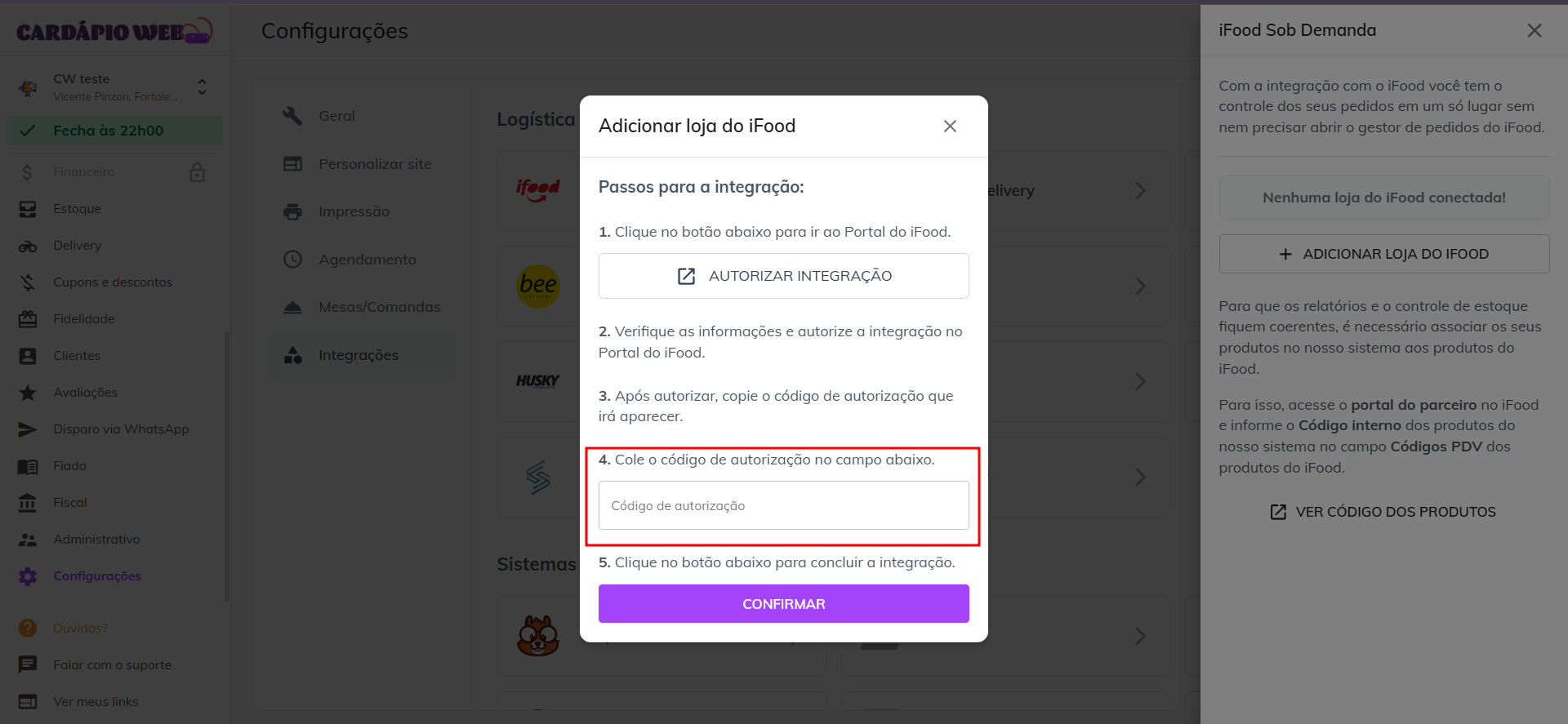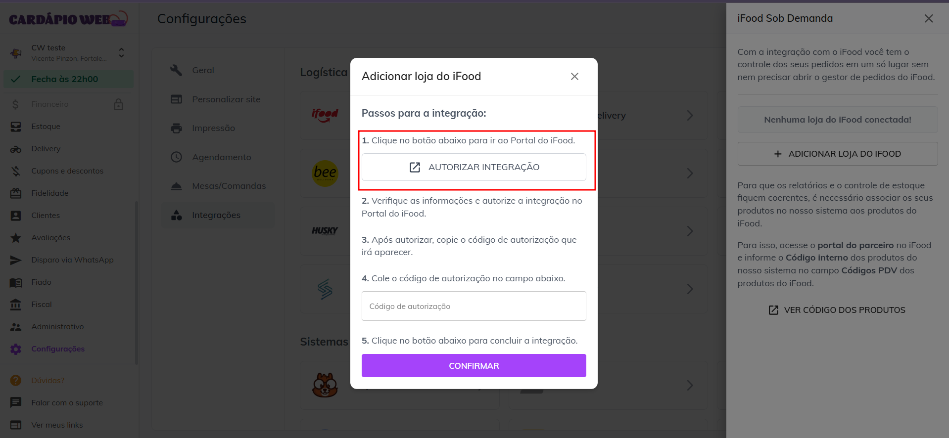 Na nova aba, você verá um campo para inserir o código de autorização. Para obter esse código, clique em **“AUTORIZAR INTEGRAÇÃO”,** que direcionará você para a sua conta do iFood.
