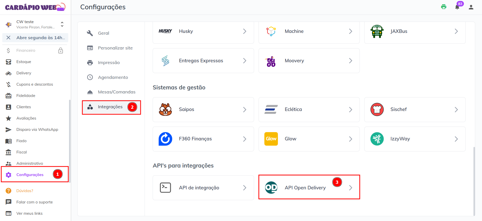 Para acessar as informações, vá em **CONFIGURAÇÕES**, depois em **INTEGRAÇÕES** e em **API OPEN DELIVERY:**
