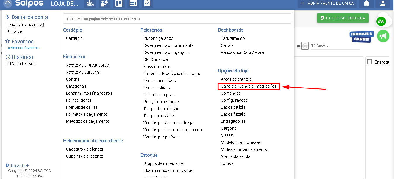 No sistema da SAIPOS, acesse o menu principal e selecione a opção **''Canais de Venda''** e **''Integrações''**.