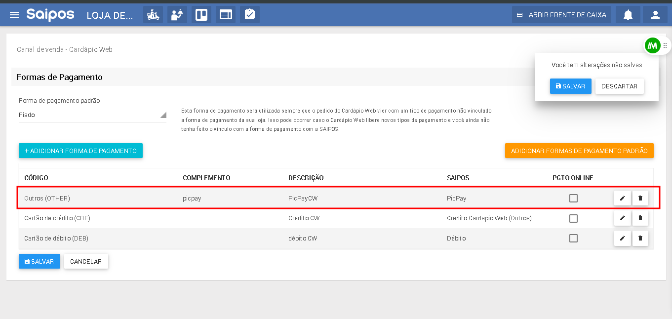 Por exemplo, no nosso sistema, o pagamento via PicPay é enviado para a SAIPOS com o código 'OTHER', o complemento 'picpay' e como pagamento não online.\