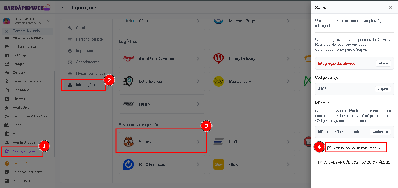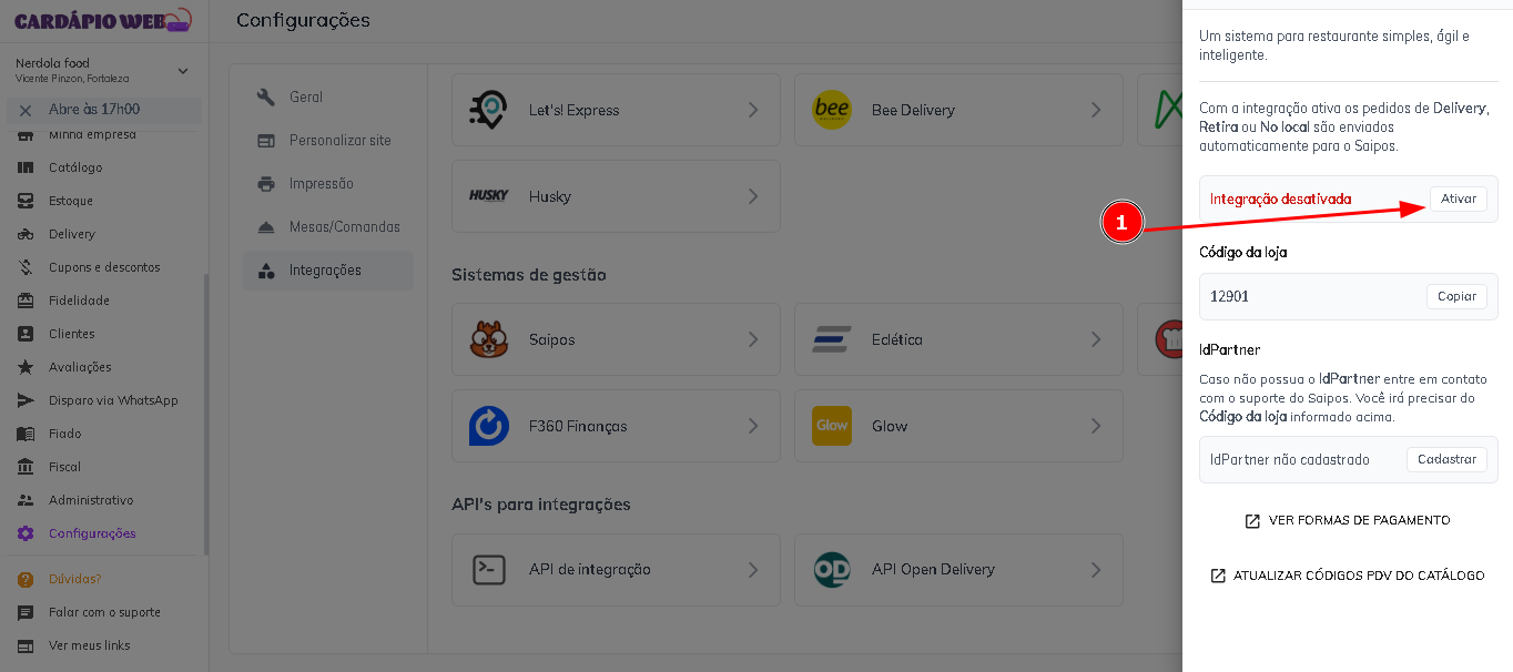 #### Para realizar a integração no sistema, é necessário ter o seu ***IdPartner***. Você pode obter essa informação entrando em contato com o suporte da **SAIPOS**, que solicitará **o código da loja em nosso sistema**. Esse código está disponível na seção de integração com a **SAIPOS** no sistema da Cardápio Web.
