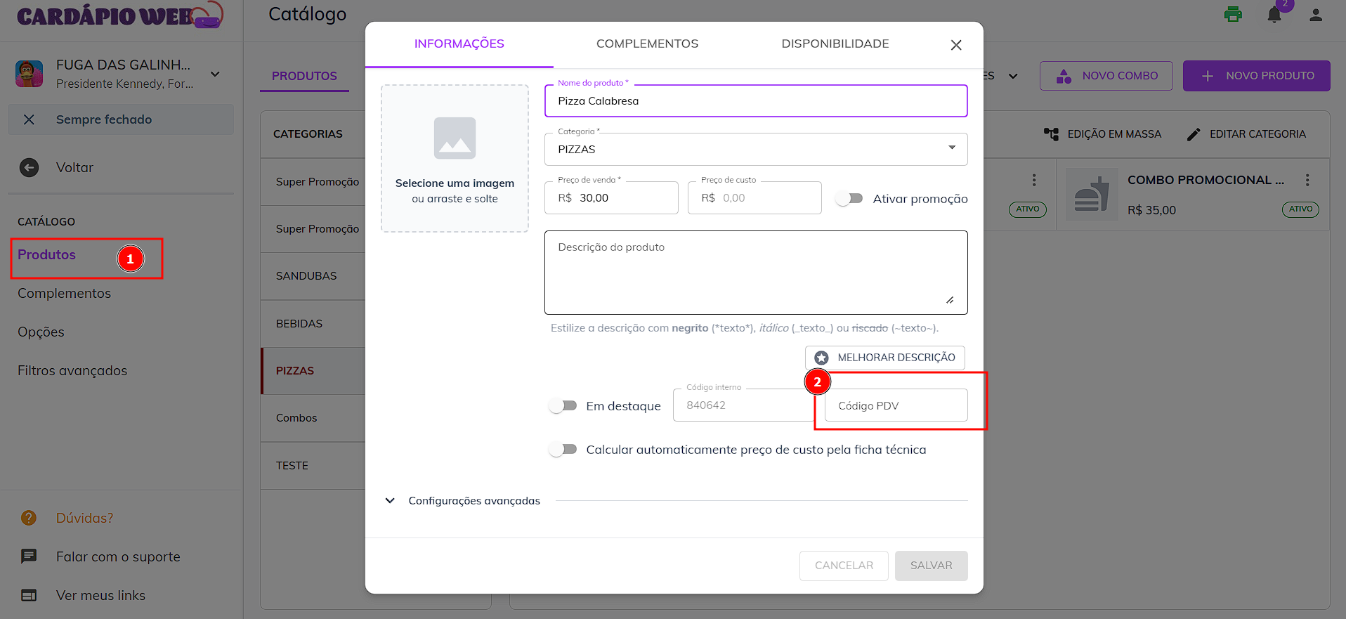 Para que a integração funcione corretamente, os códigos internos dos produtos na SAIPOS devem ser registrados no campo **"Código PDV"** dos produtos em nosso sistema.