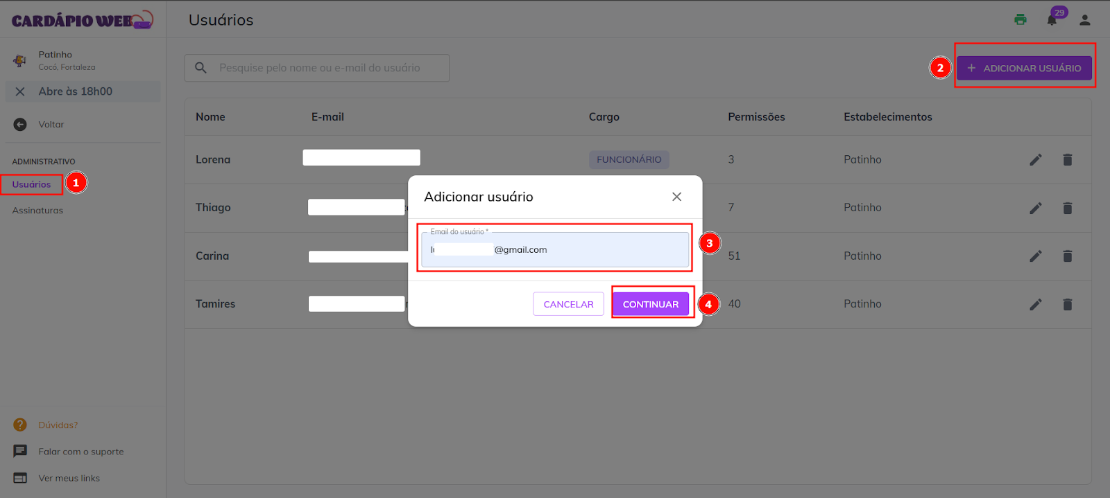 Pensando na segurança da sua conta e do seu negócio, é fundamental que somente o proprietário (ou seja, o responsável pela contratação do sistema) continue utilizando o e-mail principal da conta. Para garantir maior controle de acesso, recomendamos que os demais colaboradores sejam cadastrados como usuários com permissões personalizadas. Assim, evitamos o uso indevido do login do proprietário e reforçamos a segurança das informações.