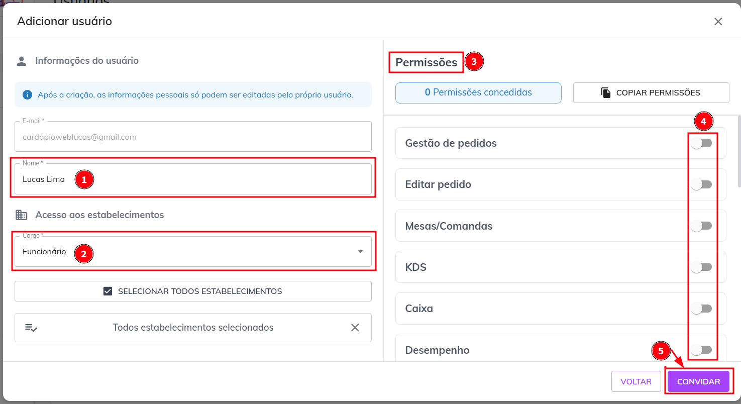 * **Permissões de acesso**: defina conforme as funções que o colaborador irá desempenhar.