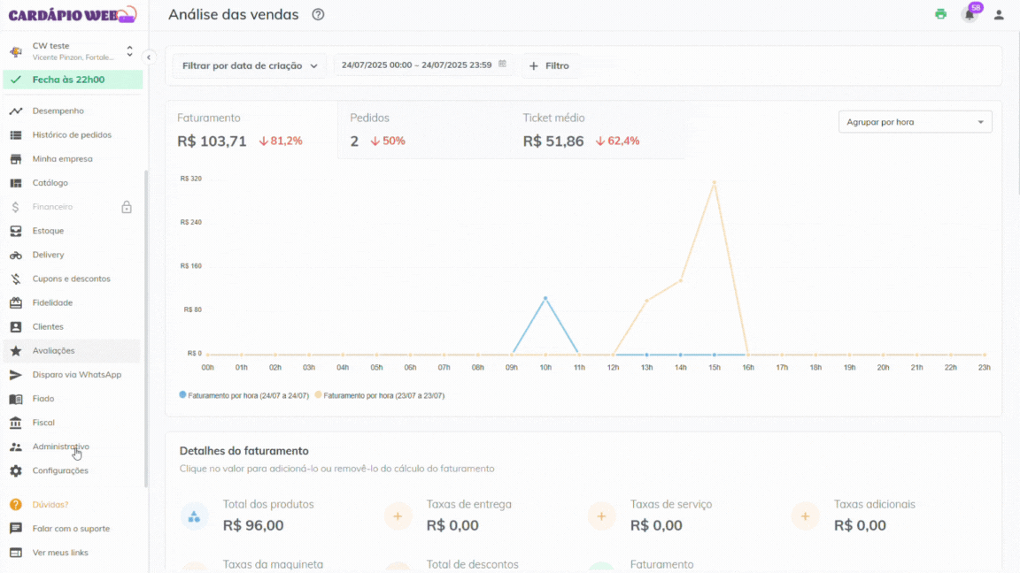 * **Configurações Gerais**: escolha de tipos de pedidos, notificações e comportamentos automáticos do sistema.