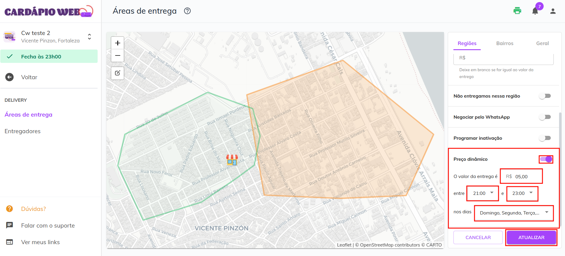 Com essa opção ativada, você poderá configurar uma variação na taxa de entrega, aumentando ou reduzindo o valor conforme o horário e o dia da semana.