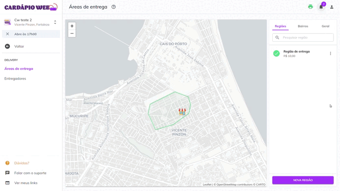 A tela de Área de Entrega, localizada em Delivery > Área de Entrega, é onde você pode configurar as regiões atendidas pelo seu delivery.