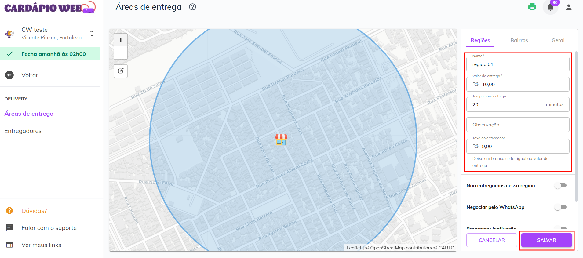 Caso precise cadastrar mais bairros, basta repetir o mesmo processo para cada nova área de entrega