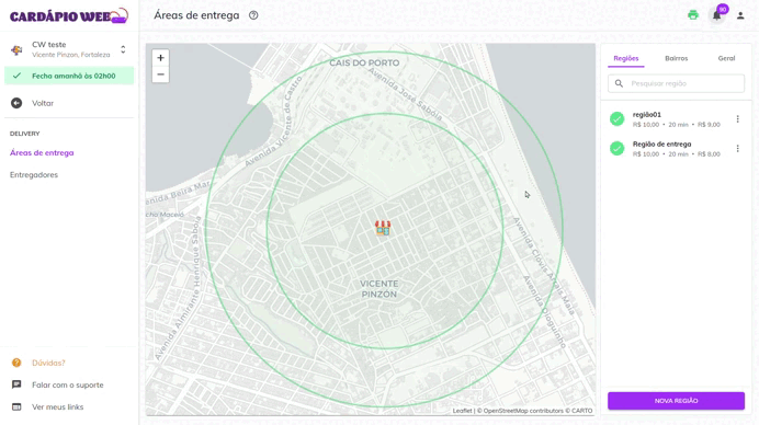 Você pode repetir esse processo quantas vezes quiser, criando novos raios com tamanhos maiores e taxas de entrega diferentes para cada região. Assim, é possível cobrar mais conforme a distância aumenta.