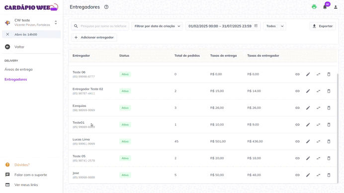 A tela **Entregadores** é o local onde você pode: