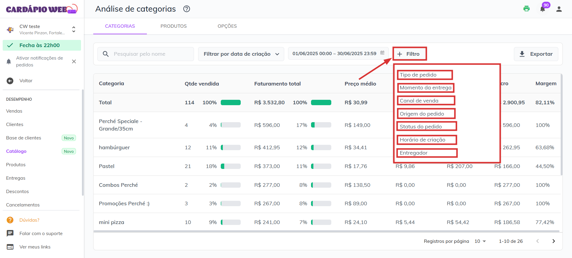 A tela de **Análise de Catálogo** oferece uma visão detalhada das vendas, permitindo que você entenda melhor o desempenho dos seus produtos, categorias e opções. Com essas informações, você pode tomar decisões mais rápidas, precisas e embasadas para otimizar seu portfólio e aumentar seus resultados.
