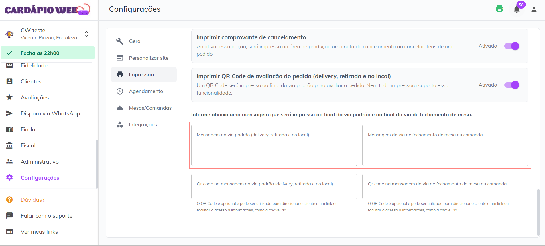 #### **Imprimir QR Code de avaliação do pedido (Delivery, Retirada e No Local)**