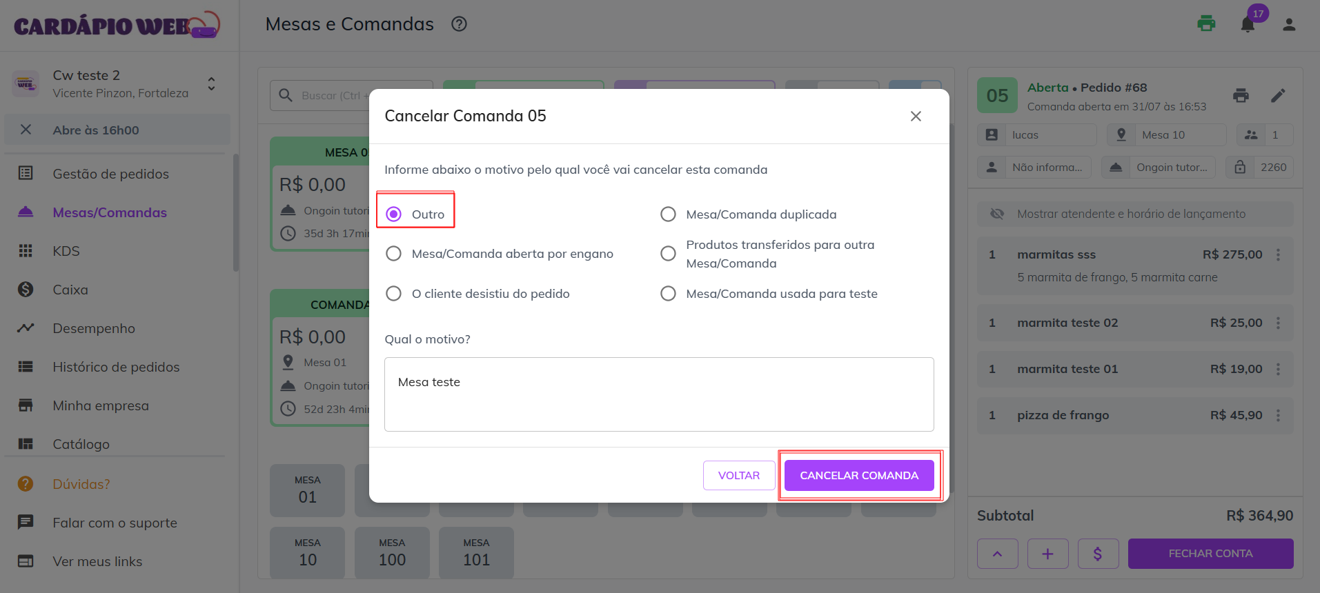* Após preencher o motivo, clique em **“Cancelar mesa/comanda”**.