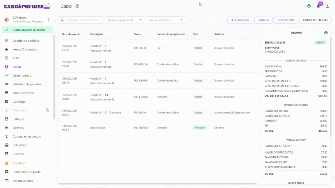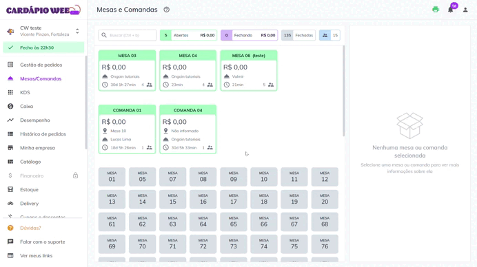 * Ao clicar, será exibido um **resumo da mesa** no lado direito da tela.