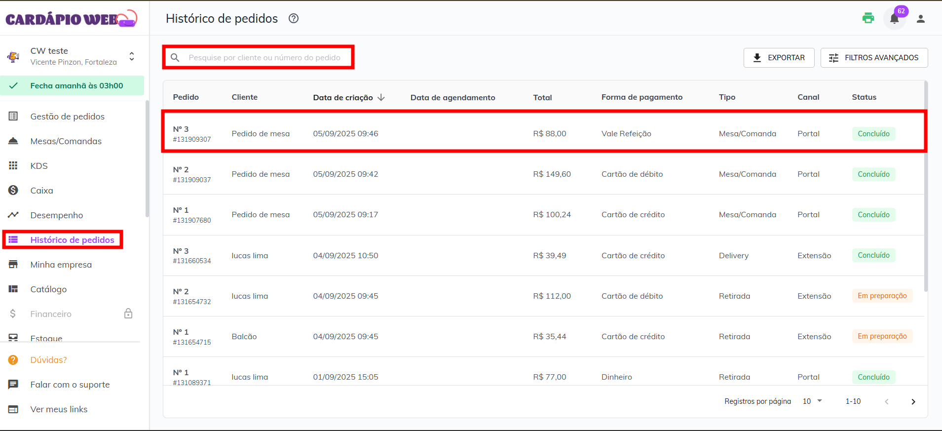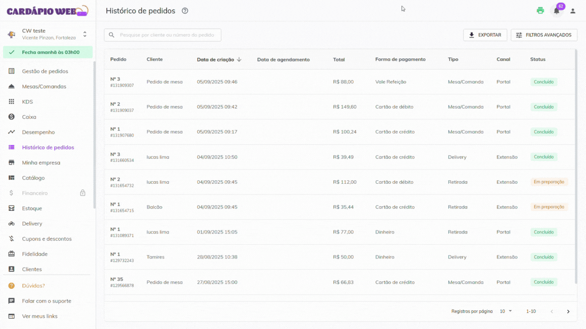 * Busque pelo **nome do cliente** ou **número do pedido/mesa**.
