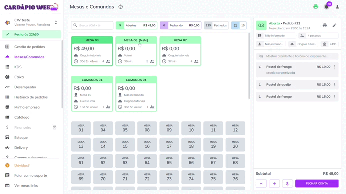 * Volte para **Mesas/Comandas**: o pedido retornará para a **mesma mesa**, com **status verde** (aberta).