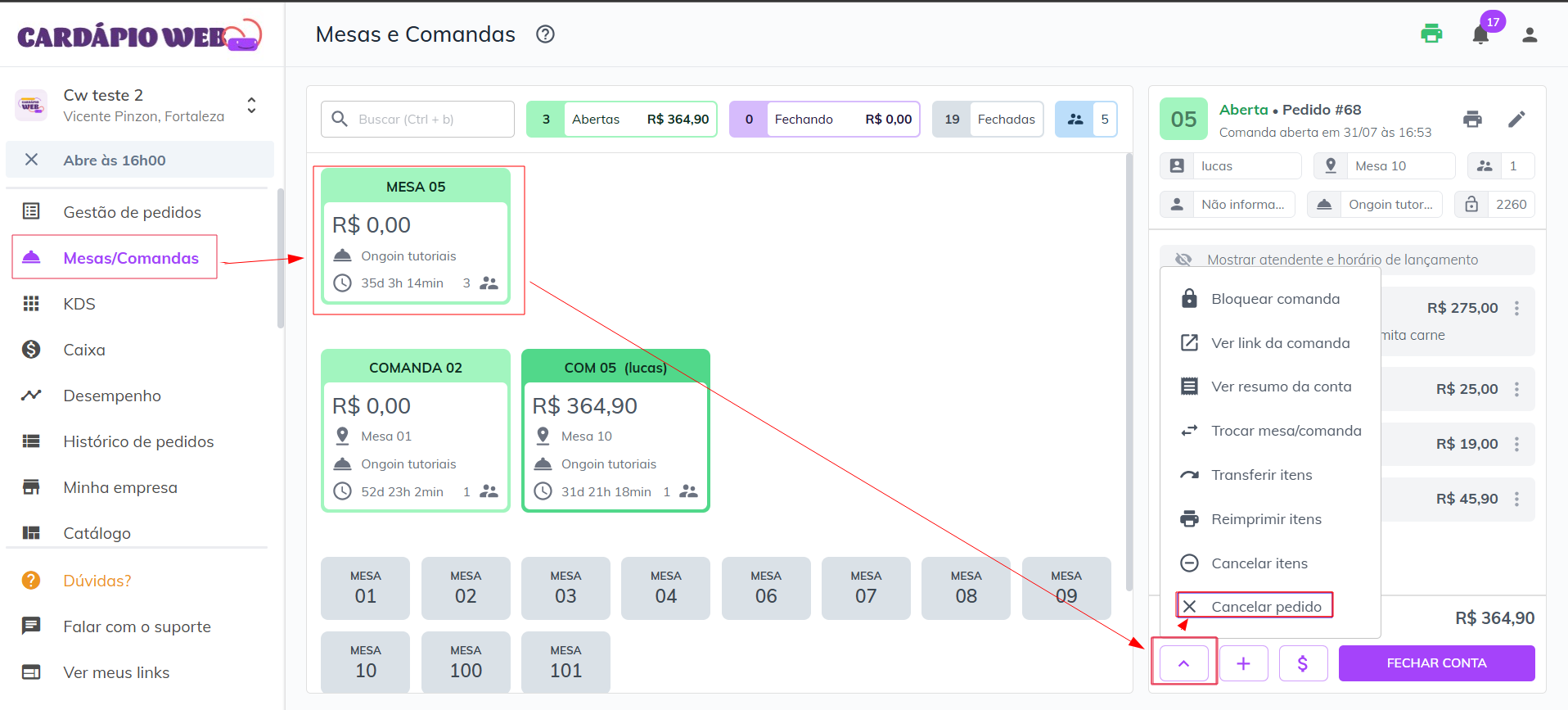 ## Como cancelar uma mesa/comanda