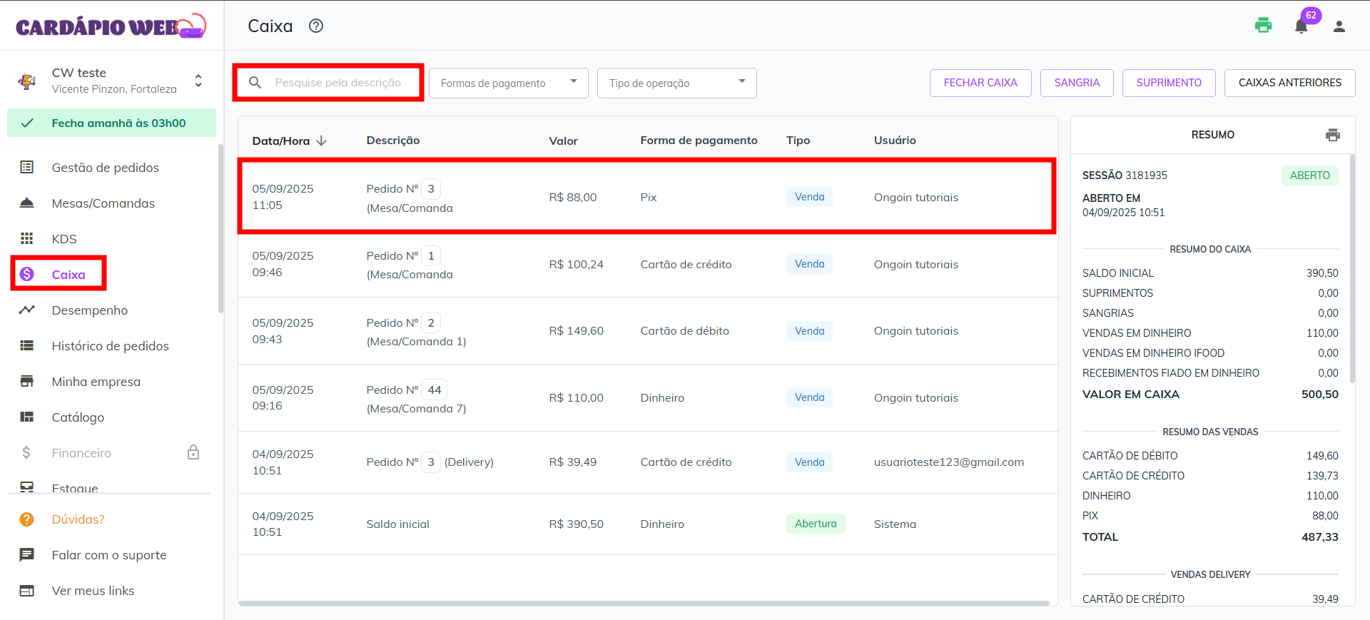 * Com o **caixa do dia do pedido aberto**, localize o pedido pelo **número**.