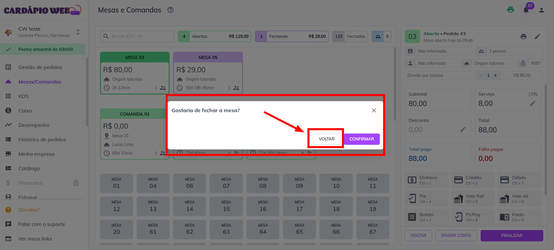 * A pergunta **“Gostaria de fechar a mesa?”** aparecerá novamente. Clique em **Confirmar**.