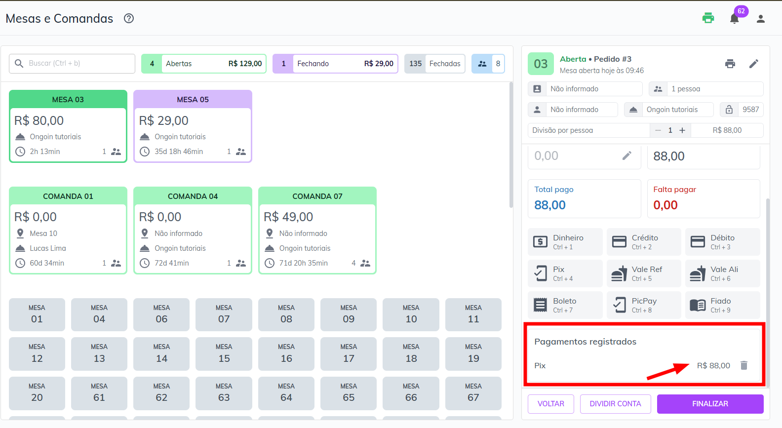 * Com a mesa reaberta, clique em **Fechar conta** ou no ícone **$**.
