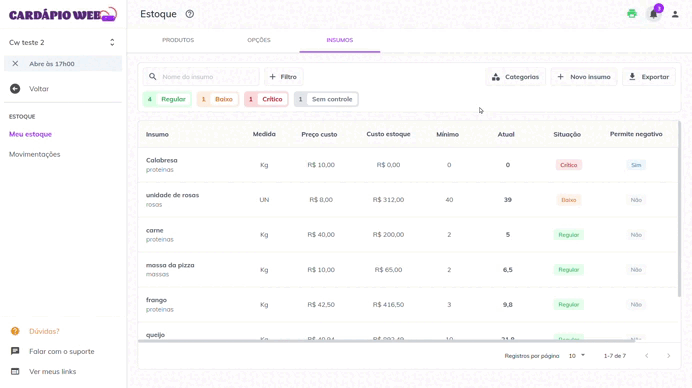 <figure><img src="https://863606674-files.gitbook.io/~/files/v0/b/gitbook-x-prod.appspot.com/o/spaces%2FQgiq7rL2tRDyT2wrDCVE%2Fuploads%2FqW53MOFwnf16nkZFo5A4%2Fimage.gif?alt=media&#x26;token=f7e9779b-ecbf-4255-8ebb-f9dc3697233b" alt=""><figcaption><p>estoque >> meu estoque >> insumos</p></figcaption></figure>