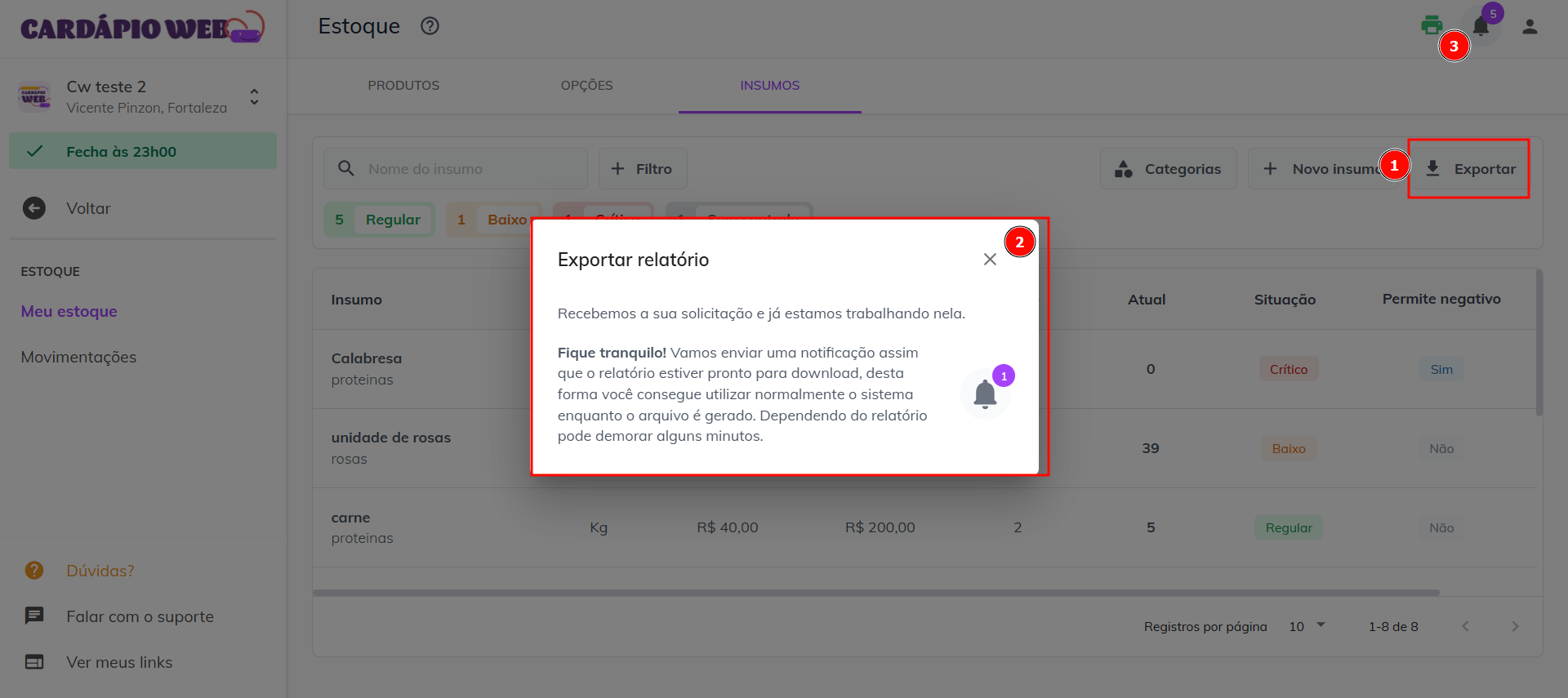 Exemplo: Se você definir o estoque mínimo como **4 unidades**, sempre que o insumo atingir essa quantidade, ele será exibido como **“baixo”** no sistema.
