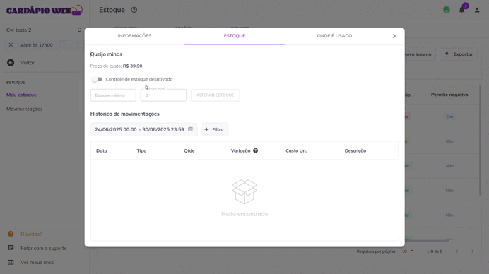 <figure><img src="https://863606674-files.gitbook.io/~/files/v0/b/gitbook-x-prod.appspot.com/o/spaces%2FQgiq7rL2tRDyT2wrDCVE%2Fuploads%2FmCtJ8BsIGnBf4tXhcixc%2Fimage.gif?alt=media&#x26;token=efc3a2d9-7bfc-4de0-9b36-a2acedc45722" alt=""><figcaption><p>ativando controle de estoque do insumo, definindo o estoque minimo e abastecendo o estoque</p></figcaption></figure>
