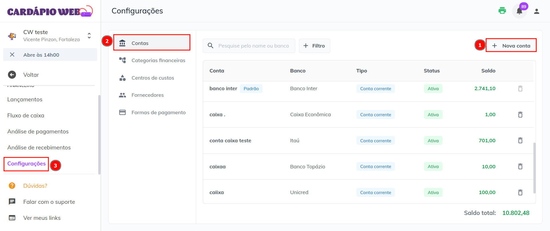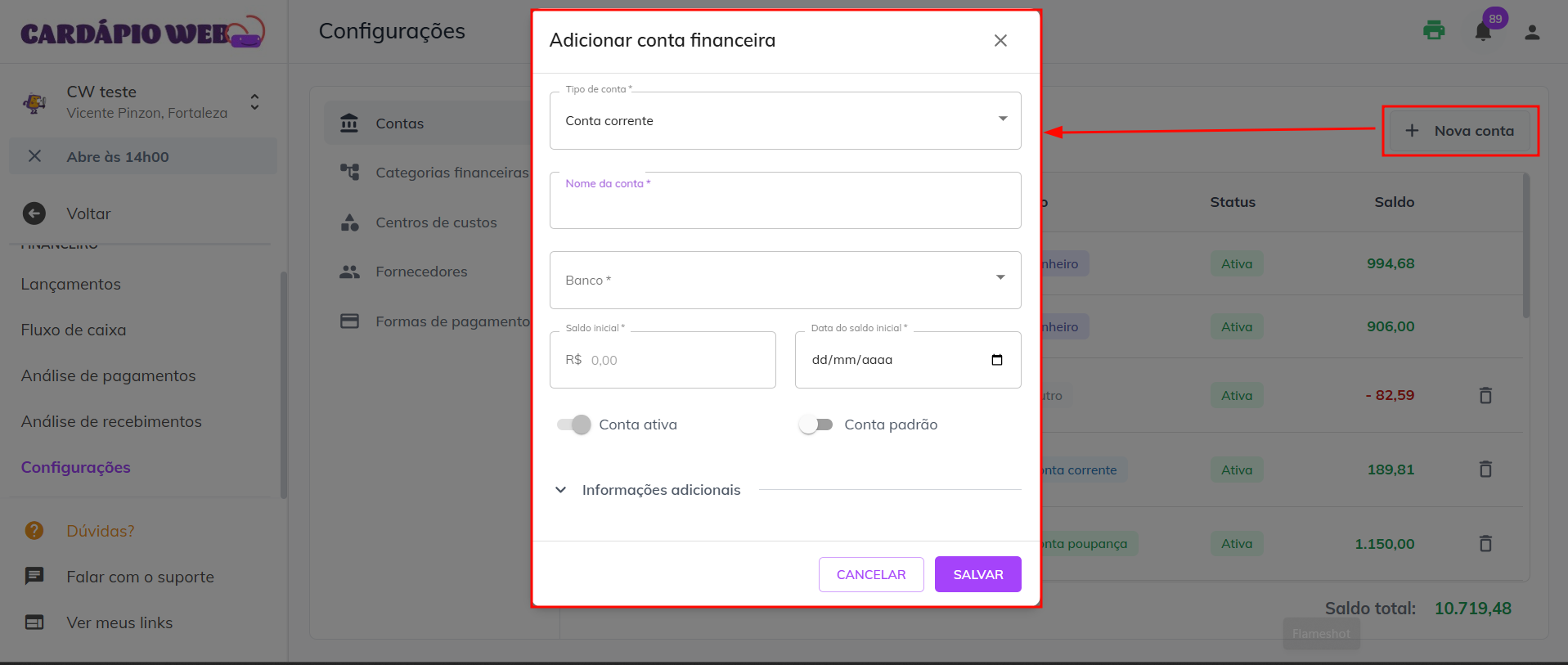 Para acompanhar melhor suas movimentações financeiras, é possível cadastrar uma ou mais contas bancárias no sistema. Veja como fazer isso: